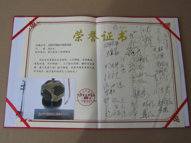 二胡制作大師丁家彭先生1949年出生樂器世家,17歲隨其祖父學琴藝,并深得精髓,其聰穎好學,悉心鉆研與 探求二胡制作,博得同行的欽佩贊許,更得了許多知名演奏家的稱贊,充分認識到二胡制作每個環節,都對二胡制作都有影響力,因此對二胡的選材,選料,蟒皮都十分嚴格,二胡整體穩定性良好,環境干擾影響極小。